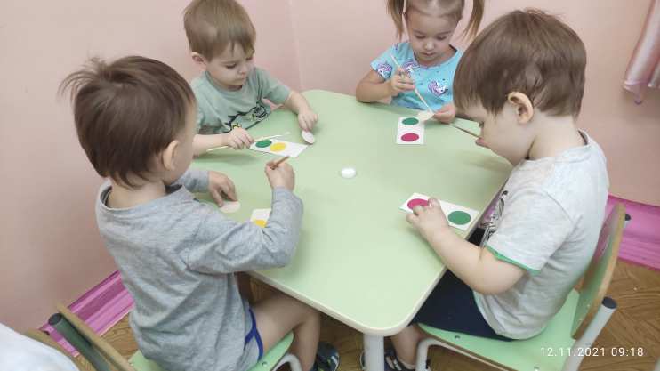 - различать и называть геометрическую форму: круг и три основных цвета;