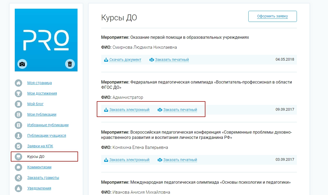 3. Вам откроется страница Вашего личного кабинета, под фото необходимо выбрать Раздел Курсы ДО. Откроется окно с информацией о пройденных мероприятиях. Вы можете выбрать: Заказать электронный или печатный документ.
