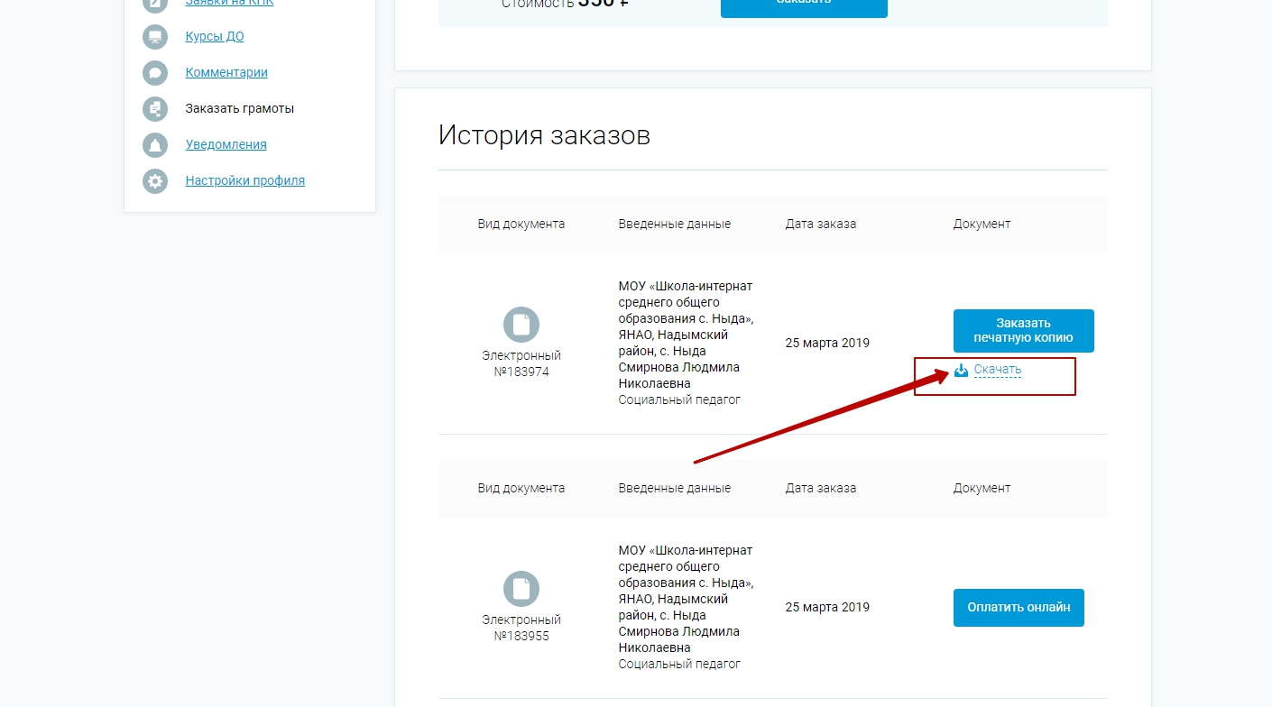 - Выбрать необходимый документ в разделе «Заказать грамоту».